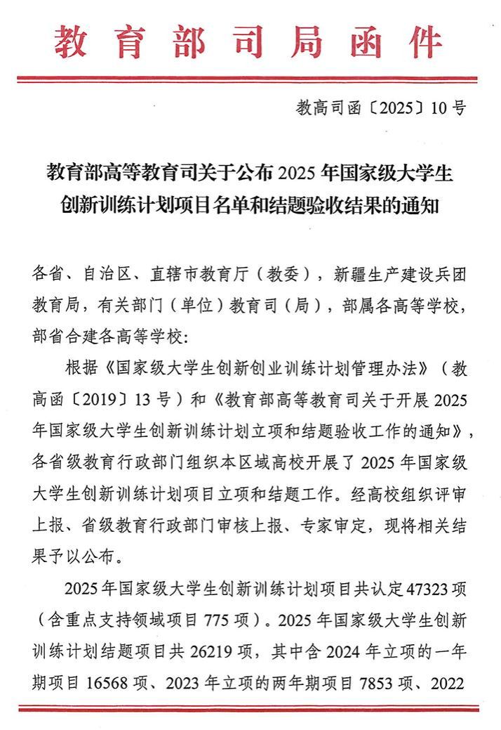 教育部高等教育司2025年国家级大创项目立项通知文件